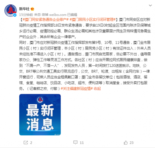 【#厦门同安紧急通告企业停产# #厦门居民小区实行闭环管理#】厦门市同安区应对新冠肺炎疫情工作指挥部18日发布紧急通告,要求自19日0时起全区范围内除涉及保障城乡运行必需、疫情防控必需、群众生活必需和其他涉及重要国计民生及特殊情况急需生产的企业外,其余所有企业一律停产。