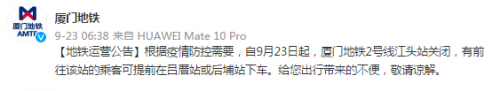 【地铁运营公告】根据疫情防控需要,自9月23日起,厦门地铁2号线江头站关闭,有前往该站的乘客可提前在吕厝站或后埔站下车。给您出行带来的不便,敬请谅解。