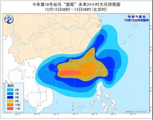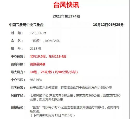 巨大的“圆规”昨日20时在距离菲律宾马尼拉北偏东方向约460公里的海面上盘旋,中心最大风力为9级,热带风暴级,预计“圆规”以每小时25公里左右的速度向偏西方向移动,今日凌晨穿过巴士海峡进入南海东北部海面,向海南岛东部沿海靠近,强度缓慢增强,最强可达强热带风暴级或台风级;并可能于13日在海南岛东部沿海登陆,登陆时强度为强热带风暴级。