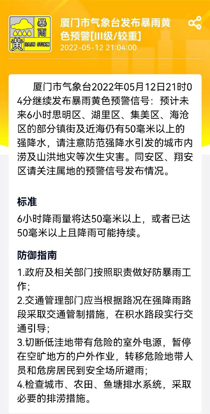 厦门市气象台2022年05月12日21时04分继续发布暴雨黄色预警信号:预计未来6小时思明区、湖里区、集美区、海沧区的部分镇街及近海仍有50毫米以上的强降水,请注意防范强降水引发的城市内涝及山洪地灾等次生灾害。同安区、翔安区请关注属地的预警信号发布情况。