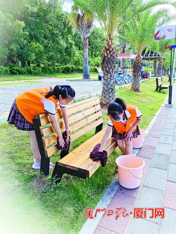 除了忙碌的大人身影,现场还活跃着一群小小志愿者。来自滨东小学六年级的蓝锦泓和她的同学自己提桶接水,用抹布仔细擦拭着海边的休闲座椅,干得有模有样。蓝锦泓的妈妈吴女士有感而发,“我们生活在这么美丽的城市,就要自觉爱护自己的家园。环岛路还是一张旅游名片,更要做好环境卫生。通过活动可以让孩子认识到自己就是这座城市的小主人,要用一言一行做好文明宣传示范。”