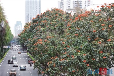 最近迎来盛花期的还有火焰木。在龙山南路,清冷的蓝花楹被热情的火焰木包围,共同组成一道别样的风景线。红艳艳的花朵点缀在碧绿之中,好似熊熊烈焰,给人以“敢于骄阳争辉”的感觉。厦禾路的火焰木同样开得热烈而奔放,一簇簇、一团团的鲜红,让人心情也随之变好。