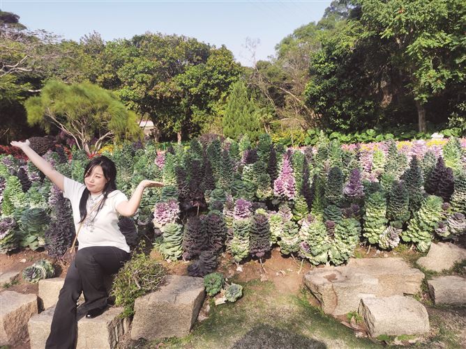 “快来看,这个又像菜又像花,真是太好看了!”近日,一名游客兴奋地招呼同伴在羽衣甘蓝区拍照打卡。一株株绿、紫、白相间的羽衣甘蓝错落有致,株形挺拔,色彩层次分明,在阳光下格外夺目。据了解,游客从植物园西门乘坐观光车至花卉园路口下车后,步行约800米石板路即可到达羽衣甘蓝区。
