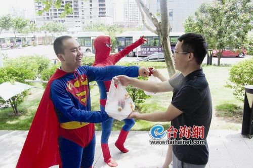 昨天中午,软件园二期的工作人员小赵点了一份快餐,不久有同事惊呼:“蜘蛛侠来给你送餐了!”——一位穿着蜘蛛侠外衣的送餐员,递上了小赵叫的外卖;而另一位“超人”打扮的送餐员,给隔壁办公室的同事送来了另一份外卖。