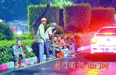 不久,来的人越来越多,路口渐渐热闹起来。住在厦门各个地方的农民工汇聚在这里,到5点30分左右,人数达到顶峰,路口至少挤满了两三百人。他们一边吃着早餐,一边操着天南海北的方言相互打听着哪个工地还要人。