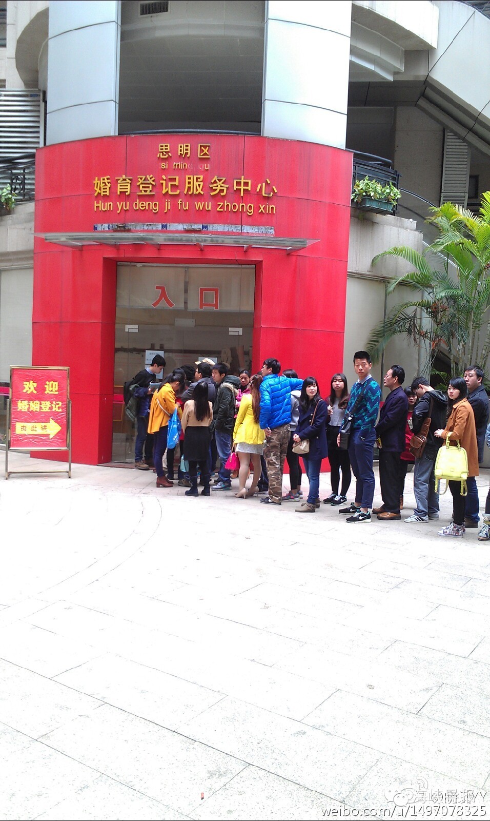 记者在现场遇到一对新人,他们说,今天早上6点多就早早来到思明区婚姻登记处,尽管登记处8点才开门,但是8点之前,已经有许多新人在门口排起了长队。