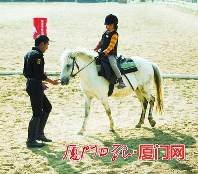 在八部天龙马术俱乐部学骑马的小游客。
