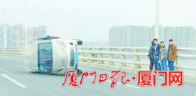 昨天上午,一部面包车在集美大桥出岛方向桥面发生交通事故,导致车身侧翻,所幸车上人员没有大碍,及时从车里爬了出来。
