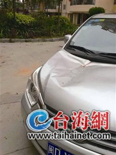 厦门一小车停在住房边上 天降大砖块砸瘪引擎盖
