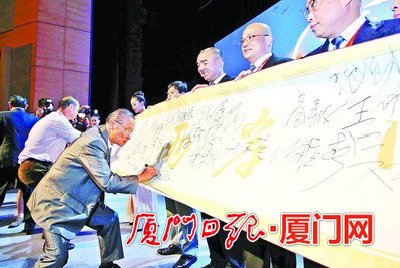 去年,两岸嘉宾在“商人节”长幅上签名,开启两岸共庆“商人节”序幕。(本报记者 王火炎 摄)
