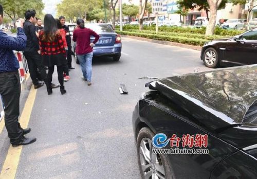 昨日下午,在湖滨东路往仙岳路方向、靠近厦门市体育中心附近路段,四辆私家车呈接龙式停靠在内侧的车道上。最后面的一辆黑色奔驰车,车头凹陷,而被追尾的三辆车中,只有一辆蓝色小车车尾有凹陷,其余两辆相对只是出现轻度刮痕。“事发前,我们前面三辆车都停下来等红灯,后面的奔驰突然就撞过来了,我的车子就往前冲,导致我前面的两辆车也遭殃了。”第三辆蓝色小车的车主说。