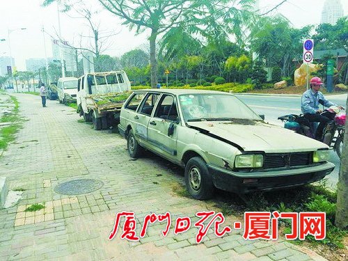 厦门金边路四辆“僵尸车”长期霸占绿化带(图)