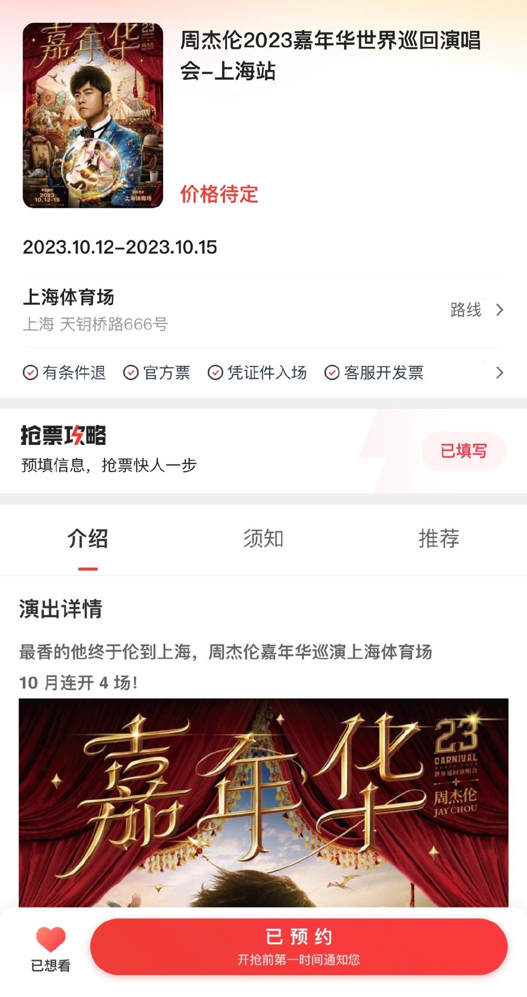 周杰伦2023嘉年华世界巡回演唱会上海站将于10月12日-15日登陆上海体育场。