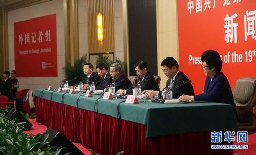 10月22日,十九大新闻中心举办记者招待会,邀请教育部、民政部、人力资源社会保障部、住房城乡建设部、国家卫生计生委相关负责人介绍满足人民新期待,保障改善民生有关情况,并回答记者提问。图为记者招待会现场。新华网 郝广鹏摄