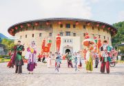 国庆中秋假期,世界文化遗产福建土楼(永定)各大景区将举办蹬技、杂技、高跷戏剧巡游等420余场非遗演艺活动,为游客打造沉浸式文旅体验。图为